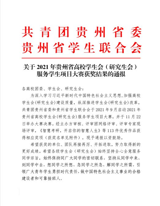 喜报——教务处学生互助学习中心系列活动荣获2021年贵州省高校学生会(研究生会)服务学生项目大赛一等奖