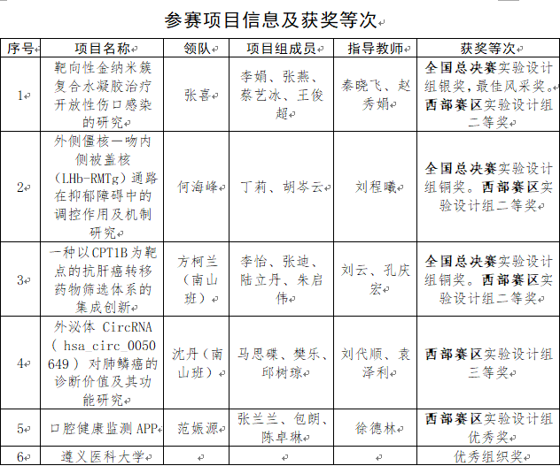 自接到大赛通知以来,按照学校领导的安排部署,我校积极组织学生踊跃报名,珠海校区、基础医学院、第一临床学院、药学院、口腔医学院、麻醉医学院、医学检验学院等院系报名参赛队伍达25个。经校内评审,遴选出6个项目参加西部赛区区赛。最终,我校学生凭借扎实的基本功、过硬的专业素养、灵活机变的发挥,喜获佳绩。