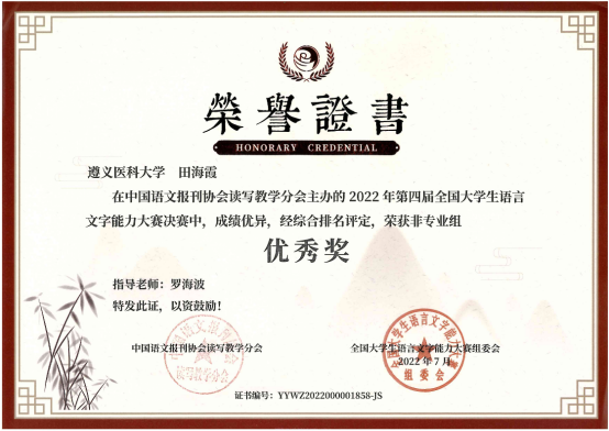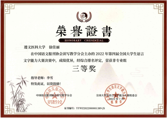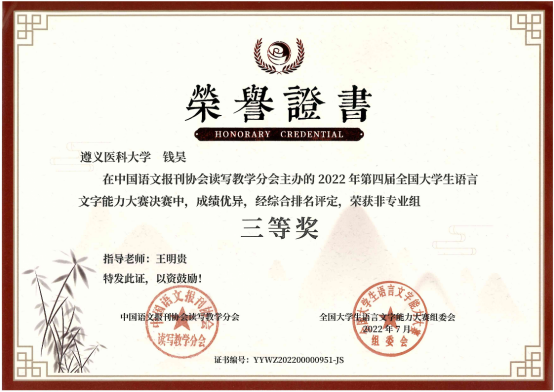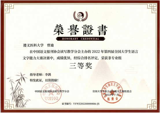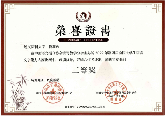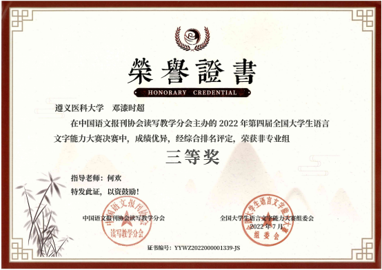 本届大赛以传承之美、文化创新、弘扬中国文化为宗旨,设有专业组、非专业组、专科组三个组别。初赛采用个人参赛和协办统考的形式同步进行,主要考察语言文字理论知识;决赛采用智能云监控考试系统,主要考察参赛者的语言文字综合应用能力,内容包括命题写作、普通话朗读、硬笔字书写三项。本次大赛共有来自清华大学、中国人民大学和湖南大学等1919所院校的学生参加。历时激烈的比拼,我校学子荣获全国非专业组三等奖5项、优秀奖5项,其获奖数位列贵州省参赛高校第一名。同时,我校还获得大赛“十佳组织单位”荣誉称号。