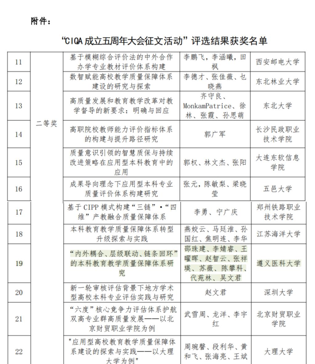 近日,在全国高校质量保障机构联盟举办的“成立五周年大会征文活动”中,学校教育教学质量控制中心邵珠建团队撰写的《“内外耦合、层级联动、链条回环”的本科教育教学质量保障体系研究》论文荣获二等奖。