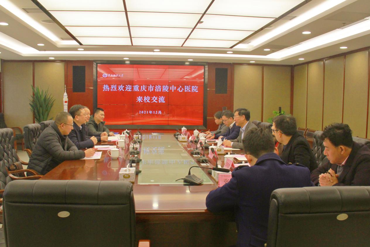 12月8日上午,重庆市涪陵中心医院党委副书记、院长王朝永,医院党委委员、副院长范德庆一行4人来校交流。双方在学校新蒲校区行政楼六楼3号会议室召开座谈会。学校党委副书记、校长刘建国,副校长李春鸣出席会议,研究生院和教务处的相关负责人参会。座谈会由教务处处长陈永正主持。